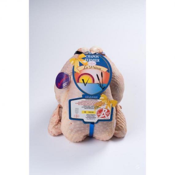 Le Chapon fermier "Prince des Dombes" est un poulet fermier que l'on castre au 2e mois de sa vie. Il passe ensuite 3 mois en plein air chez l'éleveur et vivra ainsi plus de 150 jours en se nourrissant uniquement de nourriture 100% naturelle. Le Chapon offre une chair très tendre, moelleuse et d'une saveur exceptionnelle !